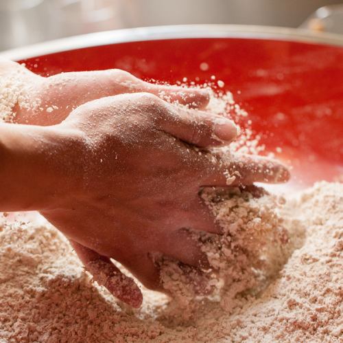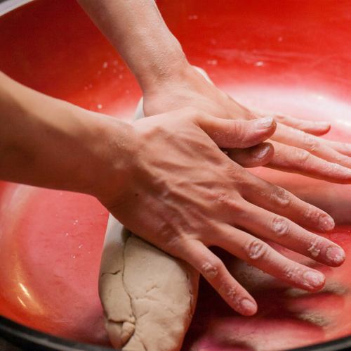 【名物の蕎麦が出来るまで】蕎麦は同じ配合や打ち方でも、その日の気温や湿度のわずかな違いで出来上がりに影響が出るほど繊細です。粉をこね、水分を練り込んで生地をまとめる過程では、そばのコシを引き出すために丹念に練り込みます。こうして作り上げた生地は滑らかさを増し、風味豊かな蕎麦へと仕上がります。