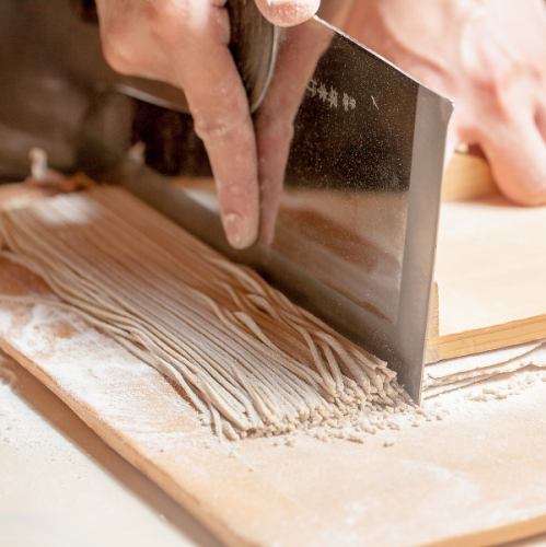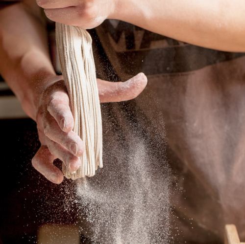 【名物の蕎麦が出来るまで】風味とのど越しの良さを追求した手打ち蕎麦は、素材を厳選し蕎麦とつなぎの割合を巧みに調整することで実現しています。手打ちだからこそ可能なこの独自の味わいを、ぜひお楽しみください。お好みの味付けで自分だけのスタイルを見つけられるのも魅力の一つです。蕎麦の深い味わいご堪能下さい。